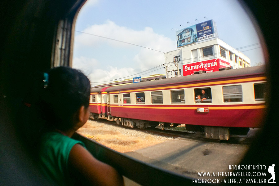 เช็คอินสถานีรถไฟธนบุรี ยื่นบัตรประชาชนรับตั๋วฟรี มีเซอร์ไพรส์ออกตามเวลาเป๊ะ 7.30 น. ปุ๊บล้อเคลื่อนปั๊บ แต่วิ่งไปวิ่งมาสุดท้ายก็สายทีละนิดจนได้ เพราะจอดรอหลีกทางให้รถขบวนด่วนกว่าตามฟอร์ม (ฮา...)