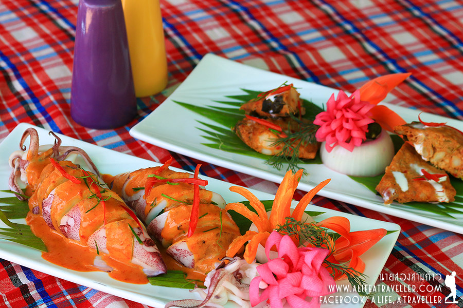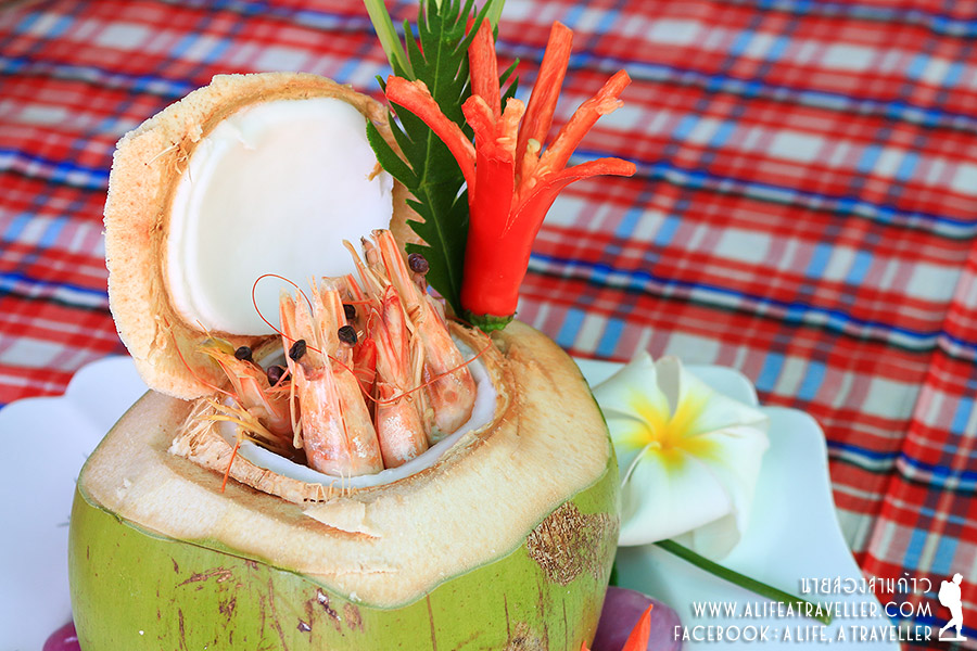 นวดเสร็จก็พักผ่อนให้สบาย ใกล้บ่ายจึงทานมื้อกลางวัน ซีฟู้ดล้วนๆ จัดไป ฉู่ฉี่หมึกยัดไส้ใบชะคราม ต้มยำกุ้งมะพร้าวอ่อนเสิร์ฟมาสวยๆ ในลูกมะพร้าว และห่อหมกทะเลย่าง