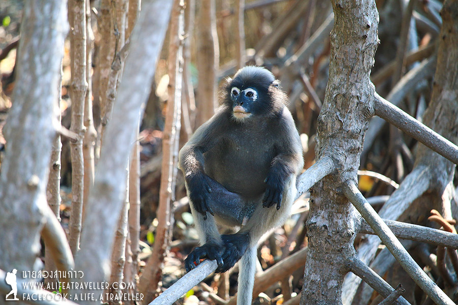 นั่งรถตู้มาสบายๆ อันดับแรกแวะที่ทำการอุทยานฯ เพื่อจ่ายค่าธรรมเนียม นักท่องเที่ยวคนละ 40 บาท โชคดีเจอฝูงคางแว่นถิ่นใต้ลงมาวิ่งเล่นหากินริมป่าชายเลน ค่างพวกนี้นิสัยดี ซนแต่ไม่เจ้าเล่ห์และดุเหมือนลิง