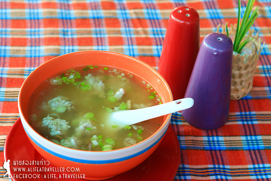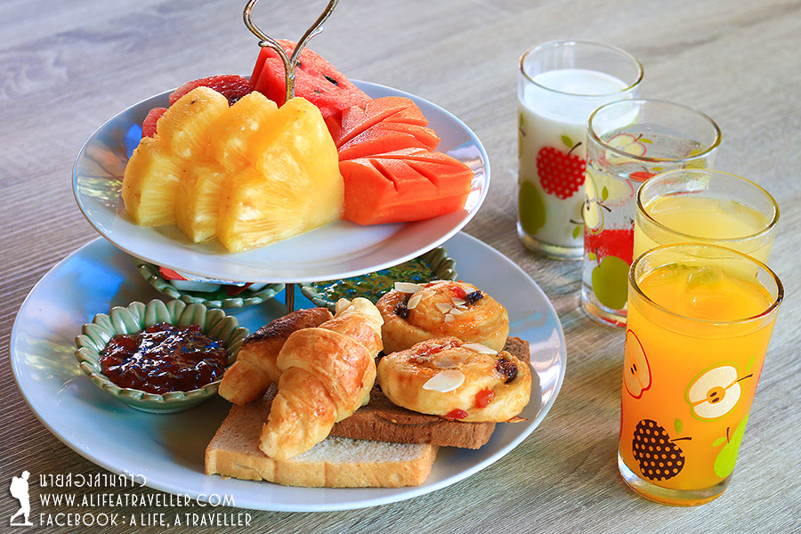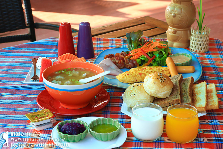 ด้วยห้องพักน้อย รีสอร์ทจึงไม่จัดบุฟเฟ่ต์ แต่ก็เสิร์ฟเสียเต็มที่จนกินกันไม่หมด จานหลักมีให้เลือกทั้งอเมริกันเบรกฟาสต์ ข้าวต้ม ข้าวผัด ผมแนะนำข้าวต้มหมูครับอร่อยดี