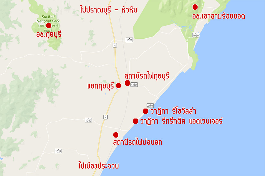 ทริปนี้ความจริงผมตั้งต้นลำพังจาก กทม. แล้วค่อยไปเจอใครคนนั้นที่รีสอร์ท เพราะบังเอิญอยู่ในช่วงเดินทางทั้งคู่ วิธีง่ายๆ จากเมืองกรุงคือขึ้นรถไฟฟรีที่สถานีธนบุรี ขบวน 255 ธนบุรี-หลังสวน เลือกลงที่ใดก็ได้ระหว่าง กุยบุรี หรือบ่อนอก ก่อนถึงตัวเมืองประจวบเล็กน้อย รีสอร์ทจะมีรถมารับเรา