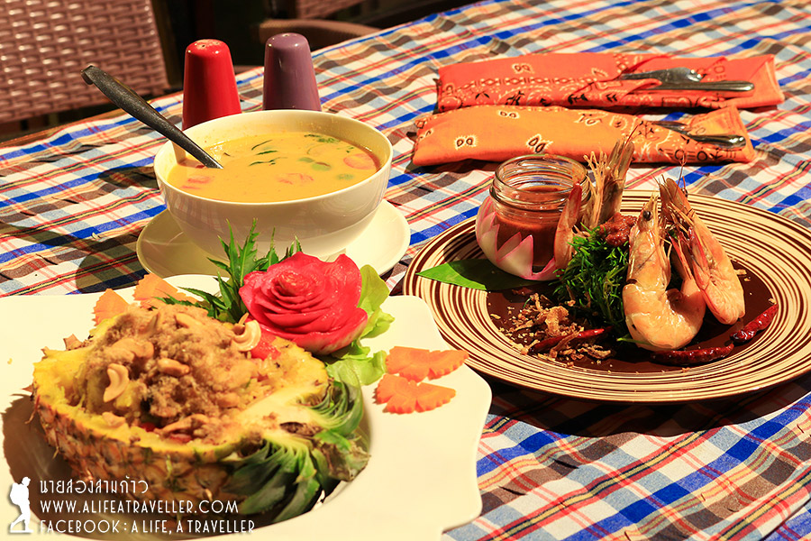 เมนูแนะนำของผมคือใบชะคราม ผักท้องถิ่นที่โตริมทะเล เป็นสมุนไพรสารพัดประโยชน์ มื้อแรกนี้มี ยำผักชะครามกุ้งสด แกงเผ็ดเป็ดย่าง แล้วก็ข้าวผัดสัปปะรด ทุกอย่างรสชาติถูกปาก
