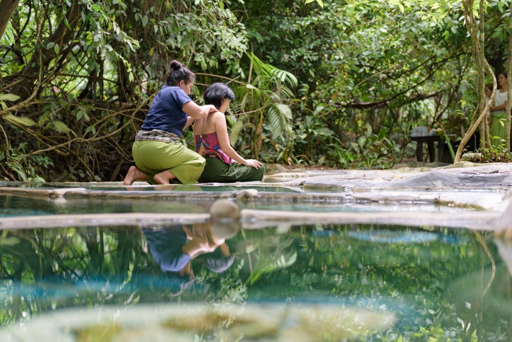 หลังจากแช่ตัวแล้วก็จะมาถึงขั้นตอนการทำโยคะไทยหรือฤาษีดัดตนเบื้องต้นเผื่อผ่อนคลายกล้ามเนื้อ แล้วจึงกลับลงแช่น้ำร้อนสลับน้ำเย็นอีกรอบ