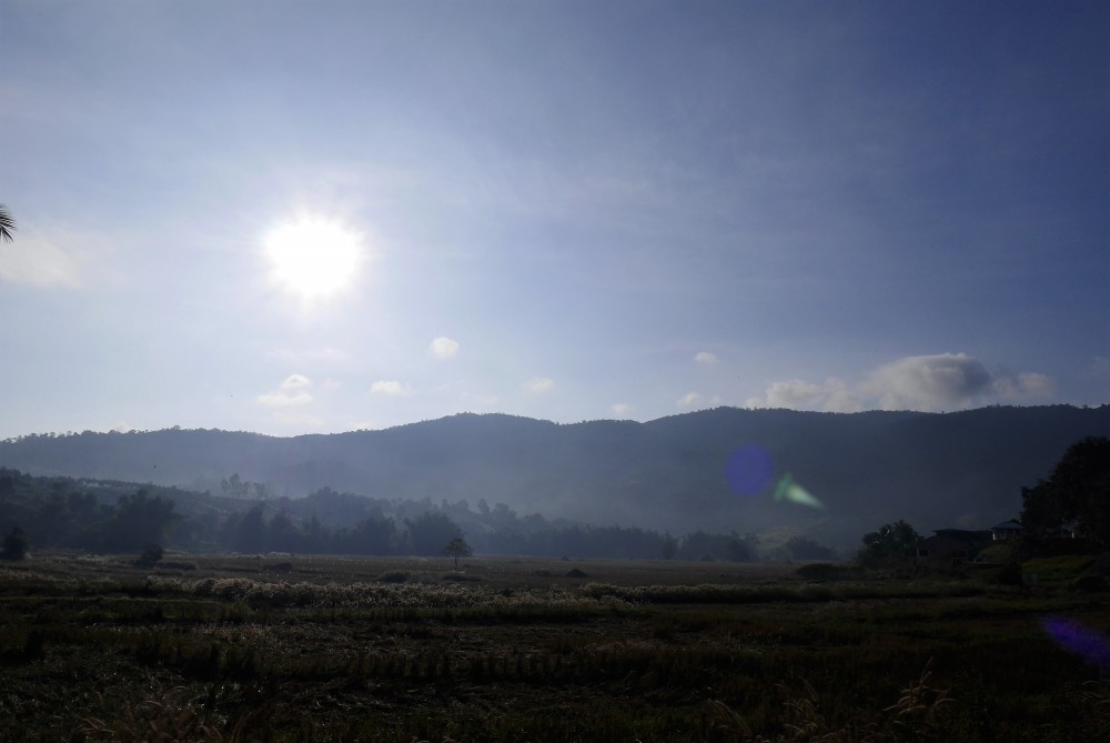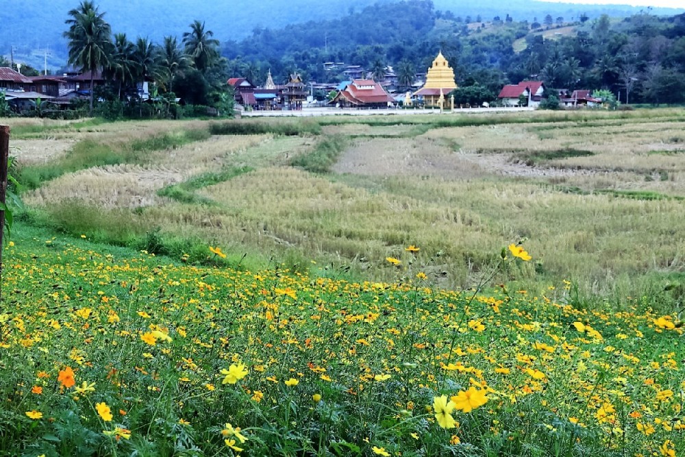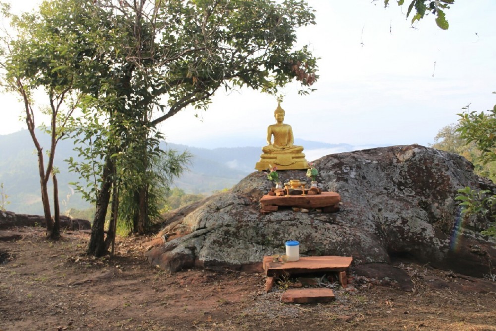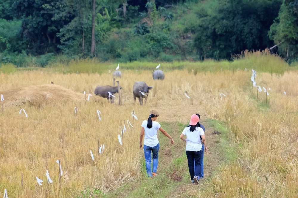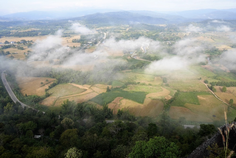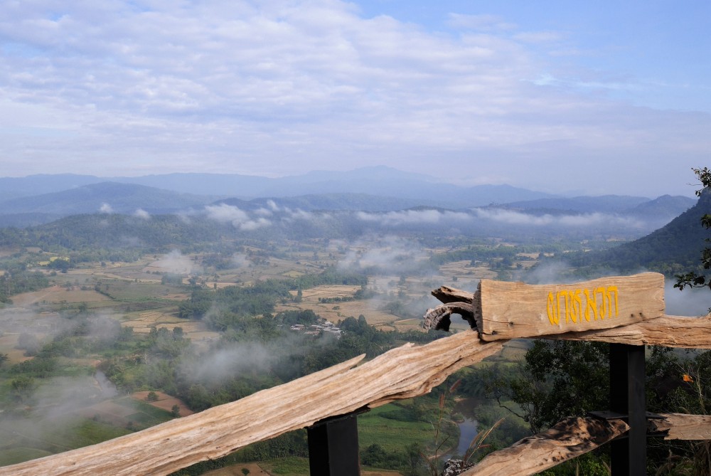 เรามาถึงจุดชมวิวแสงภา ที่มองเห็นวัดศรีโพธิ์ชัย ภูเขาและท้องนาที่เหลือซังข้าวสีเหลืองทอง แถมมีน้องควายฝูงย่อมๆ เดอะแก๊งฯ ต้องถอยหนีแอบดูอยู่ห่างๆ เพราะใหญ่กว่าเรามาก งานนี้ ปากหมาก็สู้ไม่ไหว ขอตั้งหลักทักทายอยู่ไกลๆ ละกัน ^^