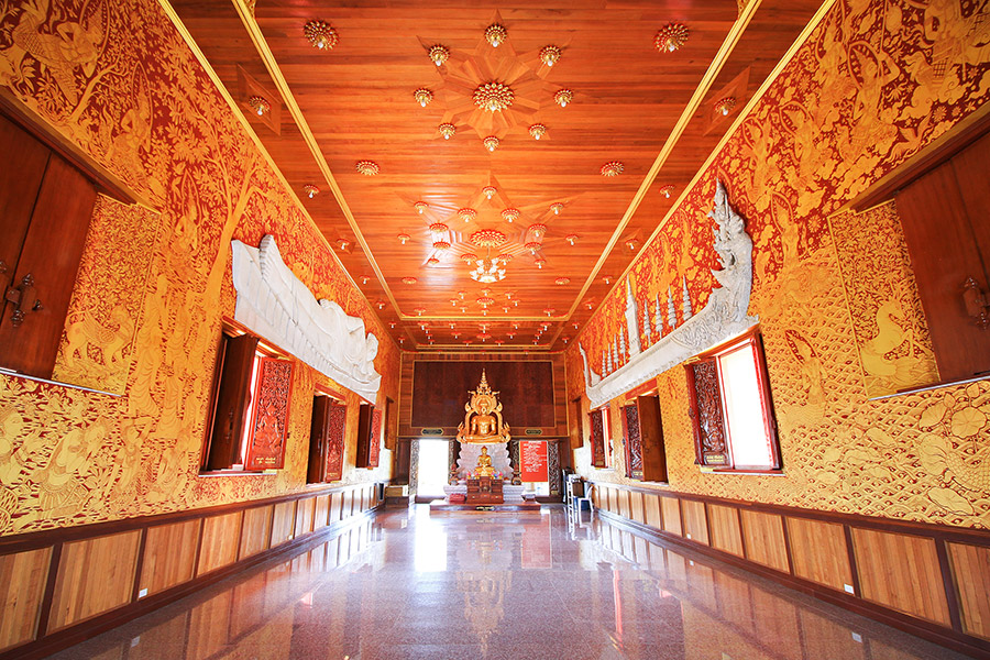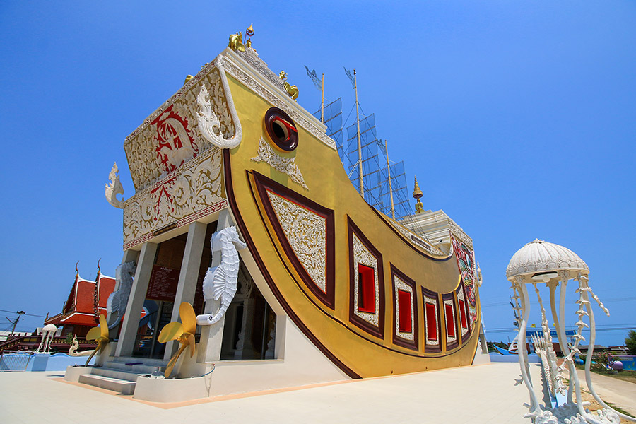 เห็นพระอุโบสถเรือสำเภาหลังใหญ่สีทองอร่ามโดดเด่นเมื่อไหร่ นั่นแหละคือวัดนอกปากทะล พระอุโบสถหลังนี้เพิ่งสร้างเสร็จไม่นาน สวยทั้งด้านนอกและด้านใน จิตรกรรมฝาผนังงดงามมาก ขณะที่ภายนอกตกแต่งด้วยประติมากรรมปูนปั้นตัวละครจากวรรณกรรมสังข์ทอง