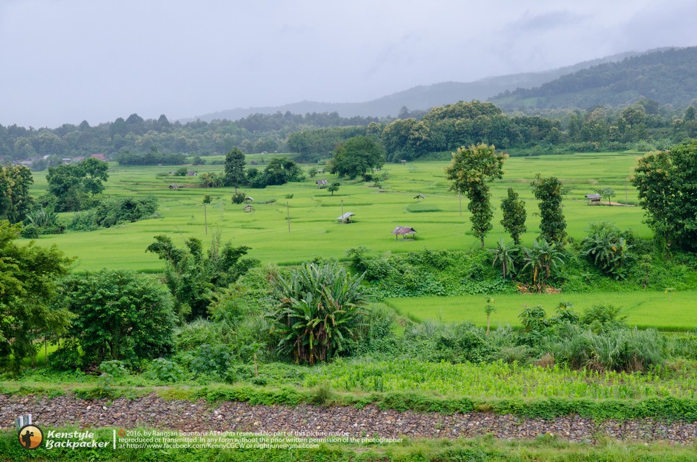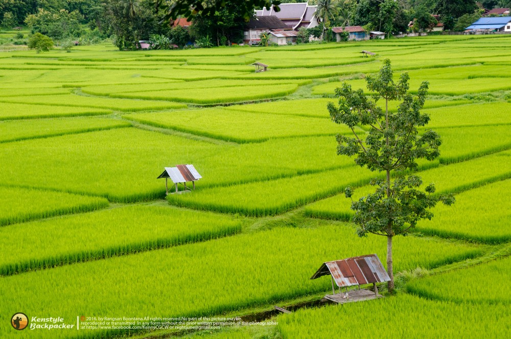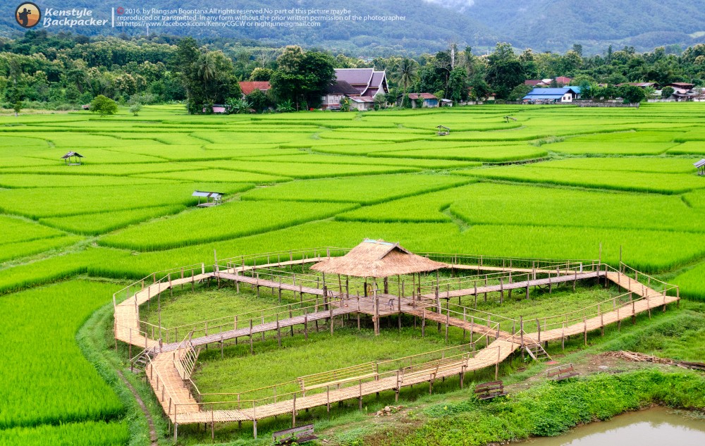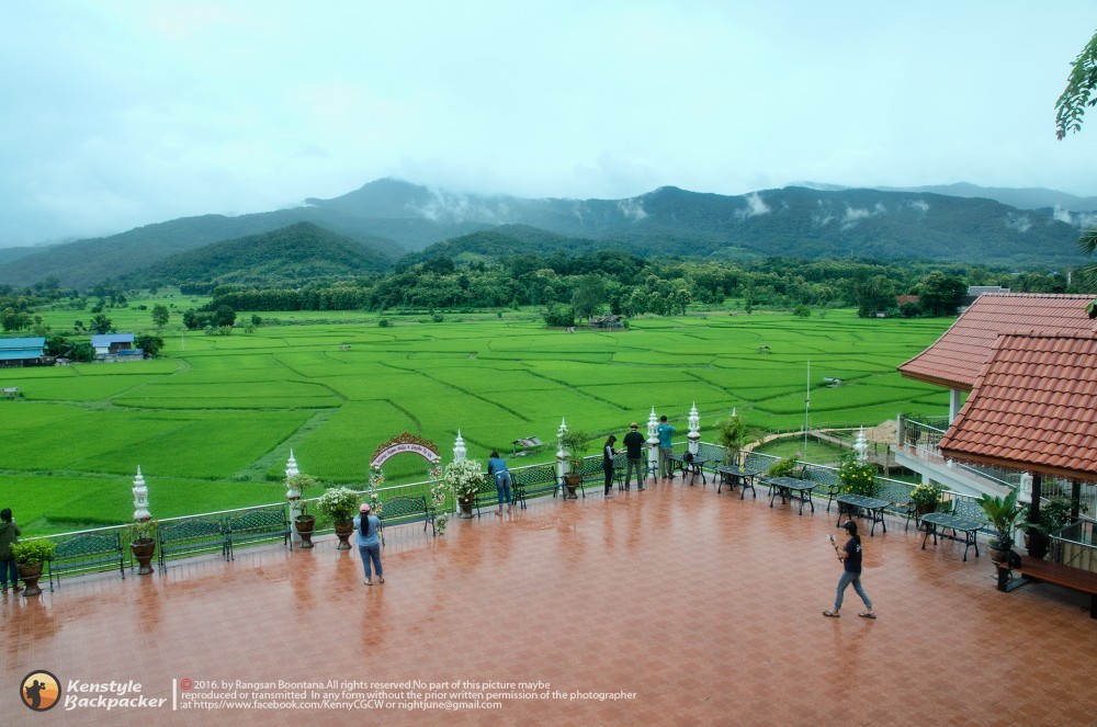 ต่อไปก็คือไฮไลท์สำคัญที่น้องๆรีเควสให้พาไปให้หน่อยนั้นก็คือวัดภูเก็ต หลังฝนหยุดไม่รอช้าขับมุ่งหน้าย้อนกลับทางเก่า มุ่งหน้ามายังจุดชมทิวทัศน์หลังวัดกันทันที ผมพยายามหามุมใหม่ๆหลังจากมาครั้งที่แล้วได้แค่มุมตรงลานดาดฟ้าหลังวัด มาคราวนี้มองไปรอบๆเคยเห็นมีคนถ่ายมุมสูงมา หันไปเห็นหอระฆังด้านซ้ายมือ เข้าใจได้ทันทีว่าต้องเป็นมุมนี้แน่นอน ทุ่งนาในช่วงเดือนนี้เขียวขจีกำลังงามเลย ต้นข้าวแน่นขนัดไปทั่วแปลง ความสูงก็เกือบๆเอวแล้ว สิ่งที่เพิ่มเติมเข้ามาในแปลงนาคือมีศาลาที่มีสะพานไม้ล้อมรอบ ลักษณะเหมือนรูปดอกบัวคงทำไว้เป็นจุดชมวิวทุ่งนาแบบใกล้ชิด และน่าจะไว้สำหรับให้ผู้ปฎิบัติธรรมมาเดินจงกรมในยามค่ำคืน
