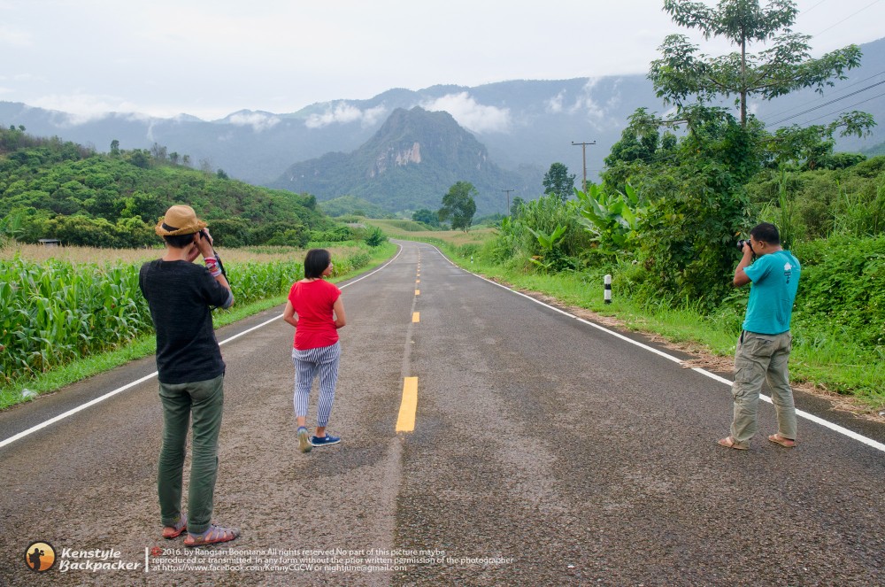 เพลิดเพลินกับการถ่ายภาพท้องทุ่งนาอยู่พอสมควร ก็ได้เวลาต้องเดินทางต่อ ทีนี้ต้องยิงยาวข้ามจังหวัดเพื่อไปนอนที่ ภูลังการีสอร์ท อ.ปง จ.พะเยา เราออกเดินทางจากปัววิ่งเส้นปัวทุ่งช้าง ตรงไปประมาณ 15 กิโลเลี้ยวซ้ายไปยังอ.สองแควไปเจอสามแยกตัดกับเส้น 1148 ท่าวังผา - เชียงคำ เลี้ยวขวาต่อไปยังอ.ปง ของจ.พะเยา เส้นทางช่วงนี้จะคดเคี้ยวไปตามไหล่เขา ถึงแม้นานๆจึงจะมีรถสวนมาสักคัน วิ่งลงเขามามองเห็นแอ่งที่ราบเบื้องหน้า มีภูเขาหินปูนตั้งอยู่ก็รู้ว่าคงใกล้จะถึงแล้ว เส้นทางที่พุ่งสู่ภูเขาหินปูนเบื้องหน้านั้น ความสวยงามทำให้อดใจไม่ได้ต้องลงไปเก็บภาพกันสัก 4-5 ใบ จากจุดนี้นั่งรถพ้นโค้งข้างหน้าขึ้นเนินไปสักเล็กน้อยก็ถึงรีสอร์ทภูลังกา