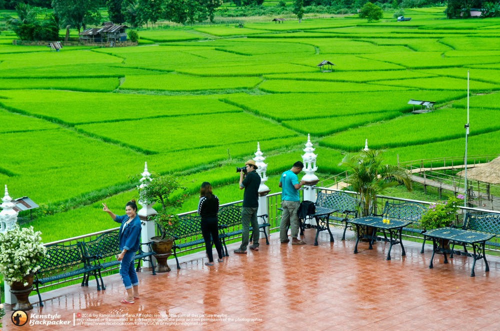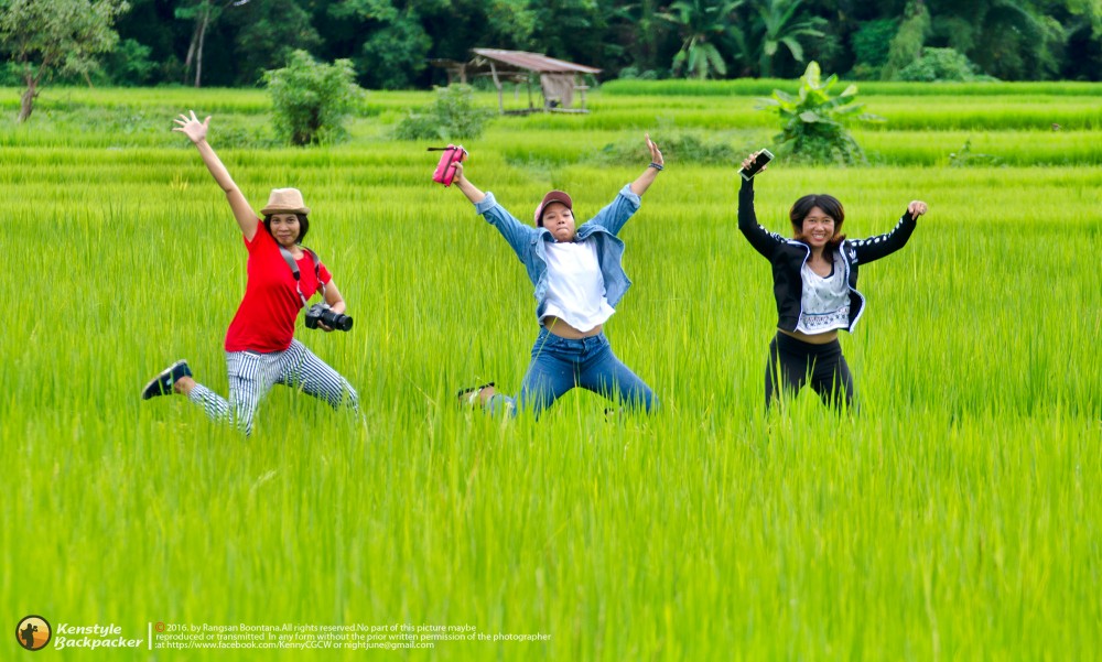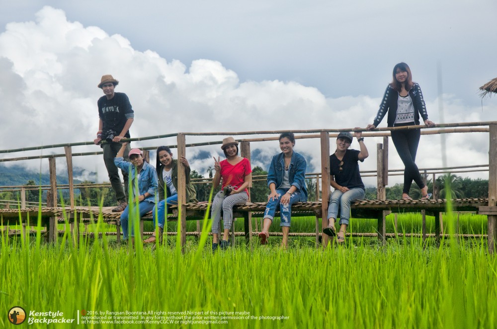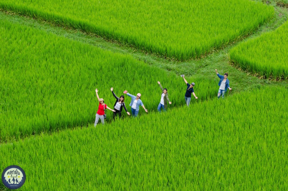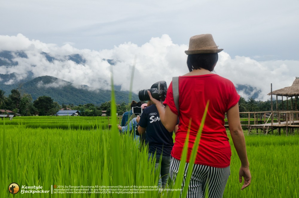 หลังจากเก็บภาพมุมสูงพอสมควร ทีนี้ก็ลงไปสัมผัสแปลงนาข้าวอย่างใกล้ชิดกันบ้าง ไม่ต้องห่วงทริปนี้น้องๆนางแบบรอเข้ากล้องกันอยู่แล้ว เลยกดชัตเตอร์กันมันทีเดียว ข้อแนะนำเสื้อผ้าควรใส่สีสันฉูดฉาดเข้าไว้ไม่ต้องกลัวควายจะไล่ขวิด เพราะที่นี่ไม่มีควาย ยิ่งหากใส่สีแดง จะเป็นโทนสีตรงกันข้ามกับสีเขียวของทุ่งนา มันจะตัดกันสวยงามทีเดียว ดังภาพ