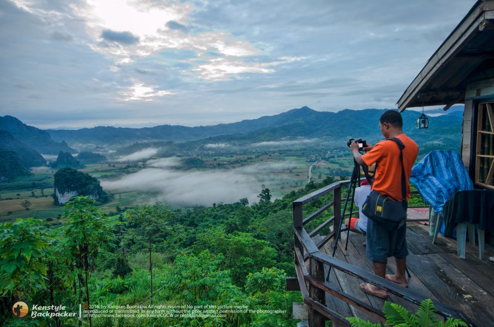 เสียงนาฬิกาที่ตั้งไว้ไม่ทันได้ปลุก เพราะตื่นก่อนนาฬิกาทุกครั้ง..ชะโงกหน้าไปดูที่ระเบียงบ้านเห็นสายหมอกไหลเอื่อยๆ ไม่มากนัก จัดแจงเตรียมอุปกรณ์ถ่ายภาพเดินออกจากรีสอร์ทตรงไปยังลานช่างภาพซึ่งจุดนี้จะเป็น landmark ที่เราเห็นภาพจุดนี้ในโลกโซเชียล ต่างคนต่างเดินหามุมที่คิดว่าเด็ดตรงบริเวณนั้น ซึ่งจริงๆแล้วมันก็มุมเดิมที่เราเห็นผ่านตากันในเน็ท จะต่างกันก็แค่แสงกับหมอกยามเช้าเท่านั้น เช้าวันนั้นสภาพแสงค่อนข้างน้อย ฟ้าเน่า แต่ยังดีมีหมอกไหลมาเป็นระยะๆ แต่ก้ไม่ถึงกับมากมายเหมือนช่วงหน้าหนาว