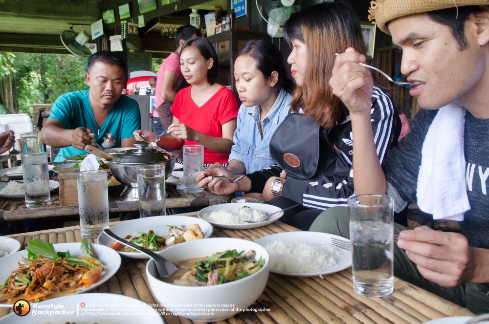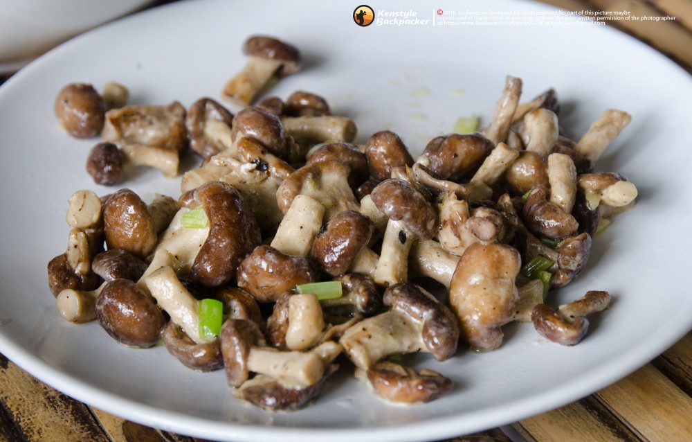 พอออกจากวัดหนองบัวได้ไม่นานฝนกลับมาตกอีกรอบเราเลยแวะหาร้านกินข้าวกลางวันหลบฝนกันก่อน ผมเลยพาบรรดาเพื่อนร่วมทริปไปกินข้าวกันที่ฟาร์มเห็ดบ้านหัวน้ำกันก่อน ทางไปบ้านหัวน้ำใช้เส้นทาง 1081 ปัว – น้ำยาว ห่างจากตัวอำเภอปัวประมาณ 5 กิโลเมตร ร้านนี้ดังเรื่องเห็ด เมนูเห็ดที่นี่ยอมรับว่าอร่อยแทบทุกอย่าง ยอมรับว่ารสชาติอาหารไม่คุ้นลิ้นคนภาคกลางอย่างผม แต่มันเป็นความไม่คุ้นลิ้นในเรื่องรสชาติความอร่อยที่เราไม่เคยเจอมาก่อนมันเหมือนว่าในอาหารที่เรากิน เขาจะใส่พวกเครื่องปรุงหรือเครื่องเทศเฉพาะถิ่น อย่างส้มตำเห็ดน้ำปลาร้าที่ใส่มาก็รสชาติแปลกๆแต่อร่อยจริง หรือจะเป็นพวกต้มยำไก่บ้าน รสชาติก็แตกต่างออกไปจากที่เคยกินมา แต่เราดันลืมสั่งเมนูขึ้นชื่อของที่นี่ไปเลย คือพิซซ่าเห็ด คราวหน้าต้องไม่พลาด