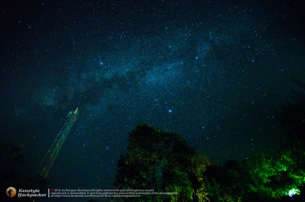 เรามาถึงรีสอร์ทก็จะค่ำแล้ว สำรวจห้องบ้านพักดูสักหน่อย บ้านพักปลูกอยู่บนเนินริมเขา สภาพห้องที่พักเป็นห้องนอน 3 คนเตียง มีมุ้งครอบให้ทุกเตียงเพราะภายในห้องไม่มีมุ้งลวดแถมตามพื้นห้อง ฝ้าเพดานก็มีช่องให้ยุงเข้าได้ทุกด้าน ยุงแต่ละตัวโตน้องๆแมลงวัน ทั้งนกหนูแมลงชุกชุมทีเดียว เข้าห้องน้ำอยู่ดีๆหนูวิ่งเข้ามาแทบสะดุ้ง สภาพแบบนี้น่าจะเรียกว่าบ้านป่าซะมากกว่าหรือไม่ก็เป็นโฮมสเตย์ อาบน้ำอาบท่าเสร็จก็ไปหาอะไรรองท้อง เมนูอาหารในรีสอร์ทก็ไม่มีอะไรพิเศษมากมาย กินข้าวเสร็จก็นั่งสังสรรค์กันจนถึงเที่ยงคืนก็แยกย้ายกันเข้านอน เดินออกมาจากเรือนอาหารมองขึ้นไปดาวเต็มท้องฟ้าน่าแปลกใจทั้งๆที่อยู่ในช่วงพายุเข้า เลยตั้งกล้องสอยช้างเผือกมาคนละเล็กละน้อย