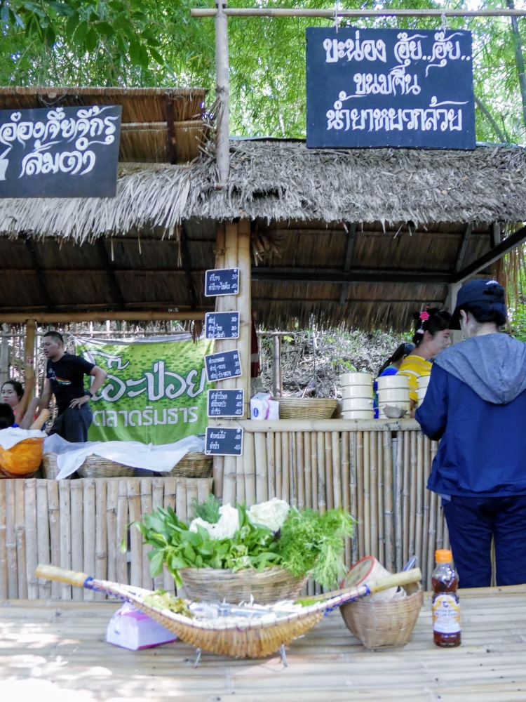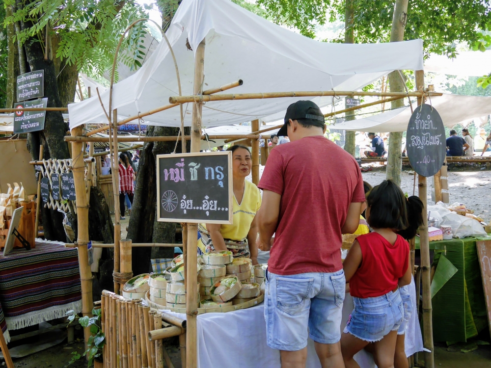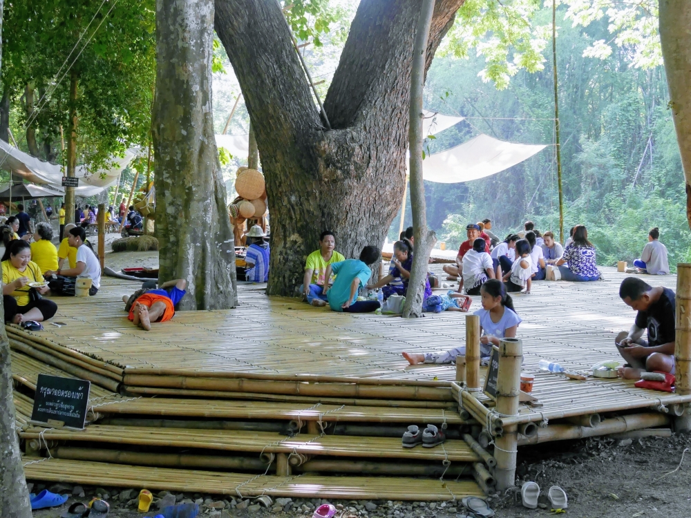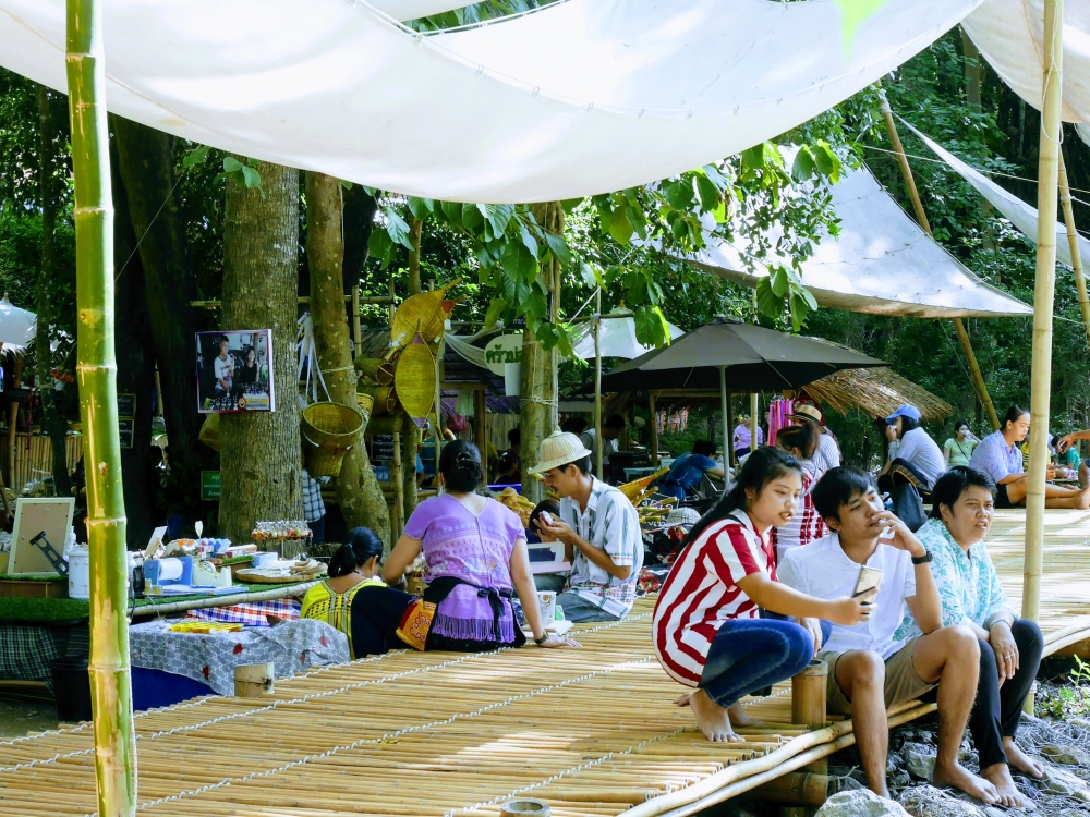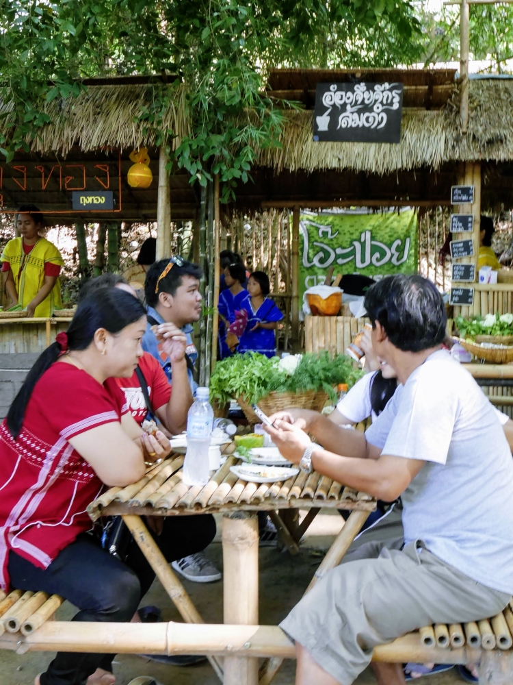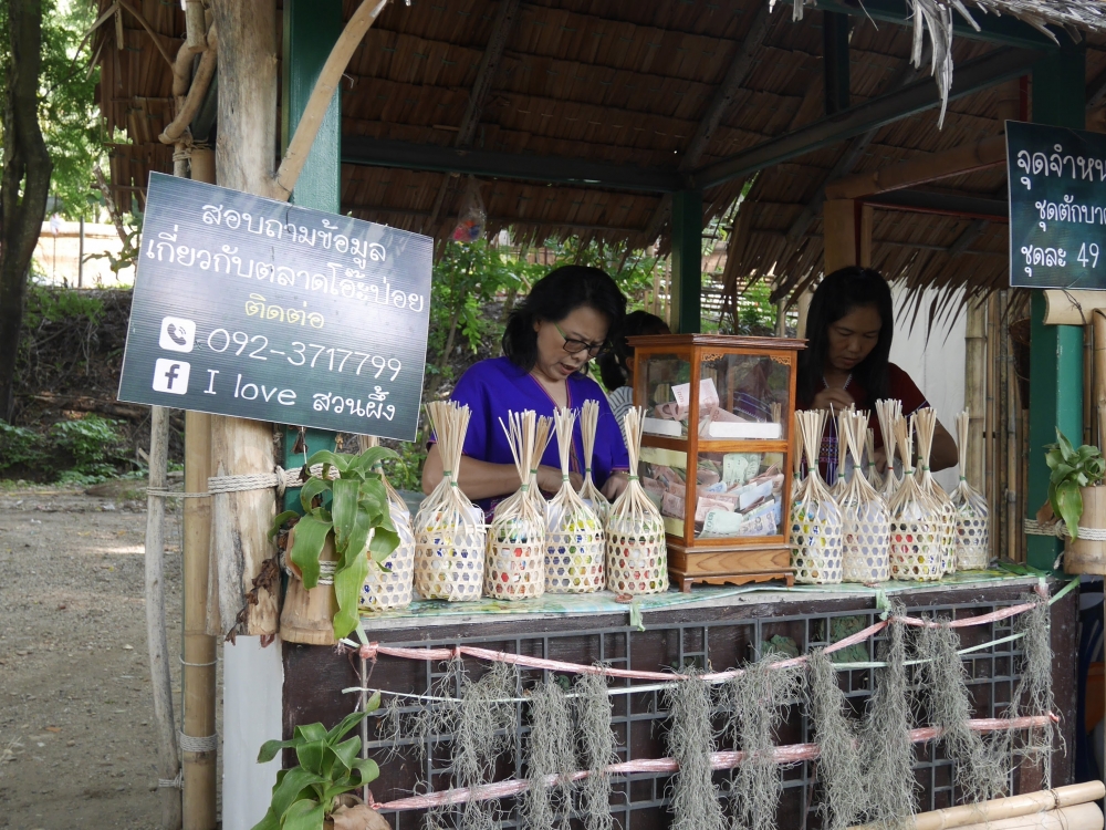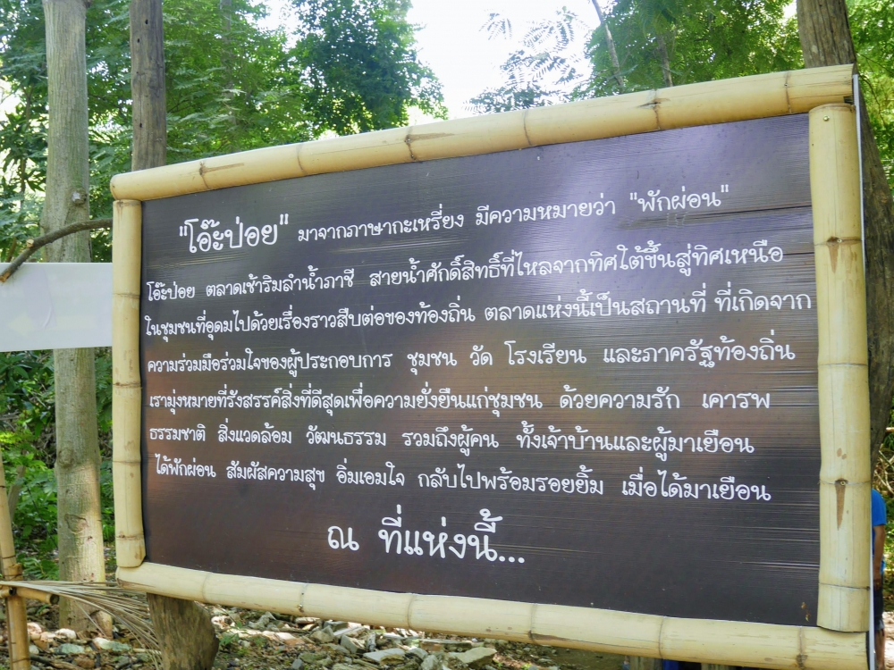 ตักบาตรเสร็จถึงเวลาตลาดเปิด ใครใคร่กินอะไรก็ไปซื้อตามใจ และมานั่งทานริมน้ำ ทางตลาดได้จัดสัดส่วนและพื้นที่ให้นั่งพักผ่อนสมกับชื่อ "โอ๊ะป่อย" ที่แปลจากภาษากะเหรี่ยงว่าพักผ่อนจริงๆ แต่เงื่อนไขมีอยู่ตรงที่บริเวณที่มีไม้ไผ่สานเป็นทางเดินหรือนั่งห้ามใส่รองเท้าเข้าไป เพราะเป็นการอนุรักษ์และเพื่อการนวดเท้าไปในตัว