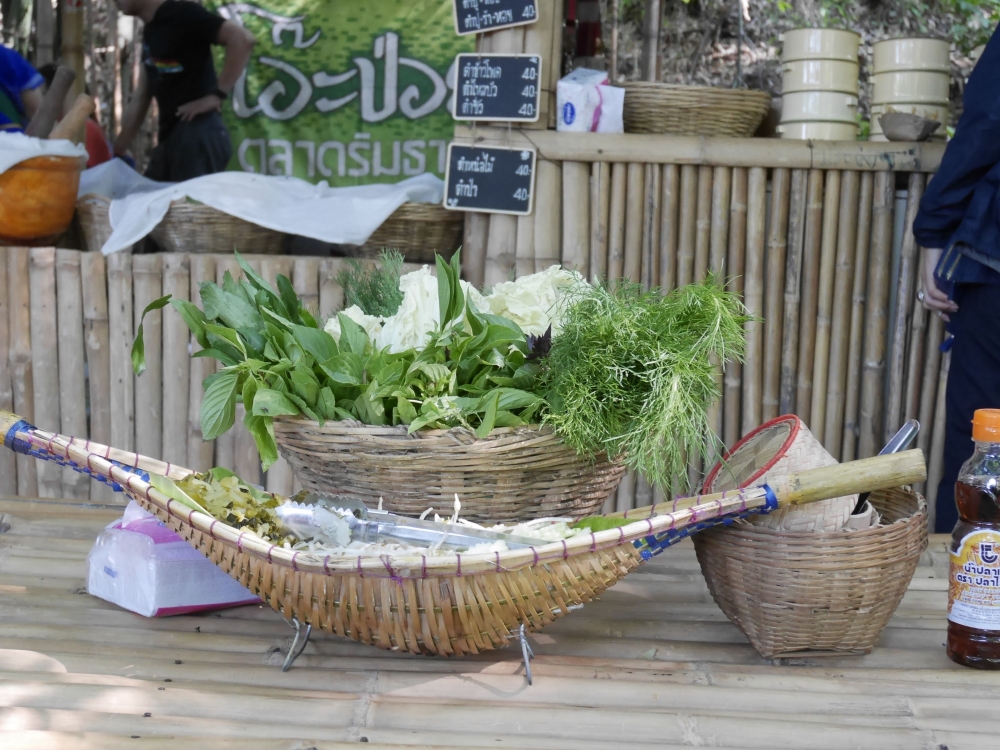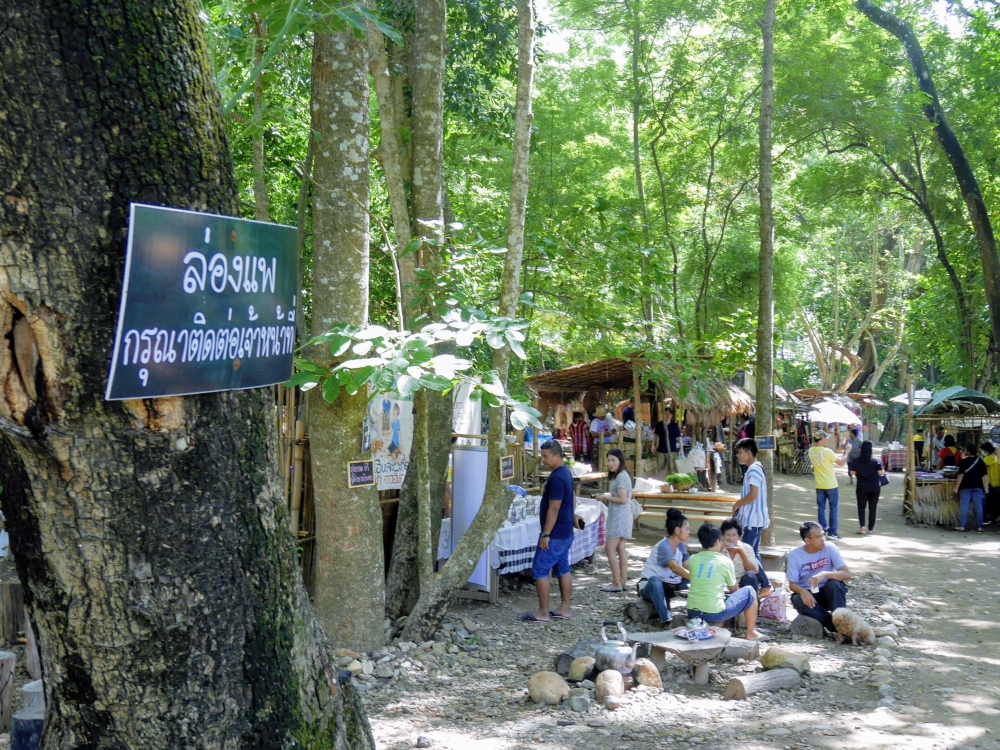 ไหว้พระเสร็จ เรารีบลงจากวัดเพื่อจะไปหาข้าวกินต่อที่ร้าน "มีนาคาเฟ่" แต่...คนและรถอย่างเยอะ จอดกันเต็มสองข้างทางเหมือนกับมีงานแจกอาหารฟรี เดอะแก๊งฯ เลย ถอยยยย ดีกว่า ไม่อ่ะอ่ะอ่ะเอา ดีกว่า ขับรถผ่านไปปักหมุดใหม่พุ่งตรงไปอำเภอสวนผึ้ง จังหวัดราชบุรีกันเลย ระยะทางประมาณ 74 กิโลเมตร เพราะเป้าหมายต่อไปของเราคือ "ตลาดโอ๊ะป่อย"
