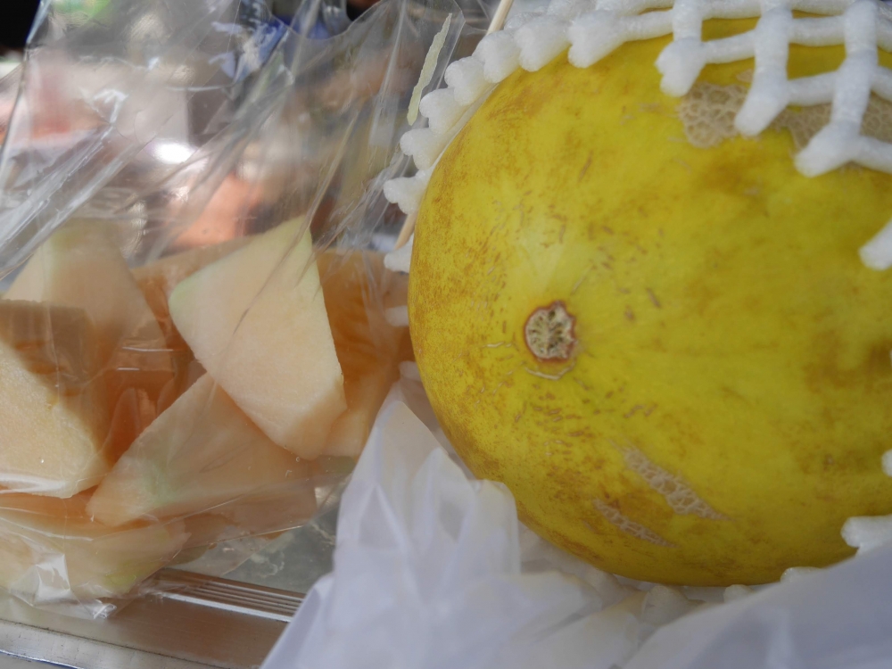 สาวคิกขุฯ เงยหน้ามามองเห็นที่ร้านปิดป้าย เมล่อน 3 ลูก 100 บาท รีบสิค่ะ!!! จัดแจงลงไปซื้อ ขอชิมทั้งๆที่ เขาไม่มีให้ชิม เซ้าซี้เจ้าของร้านว่าถ้าซื้อแล้วจะปอกให้ไหม เพราะอยากกินเลย แต่พี่เจ้าของร้านบอกปกติเราไม่มีบริการปอกให้นะ แหม๋+++ ซื้อหลักร้อยแต่อยากได้บริการหลักล้าน 5555