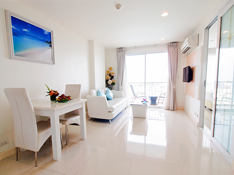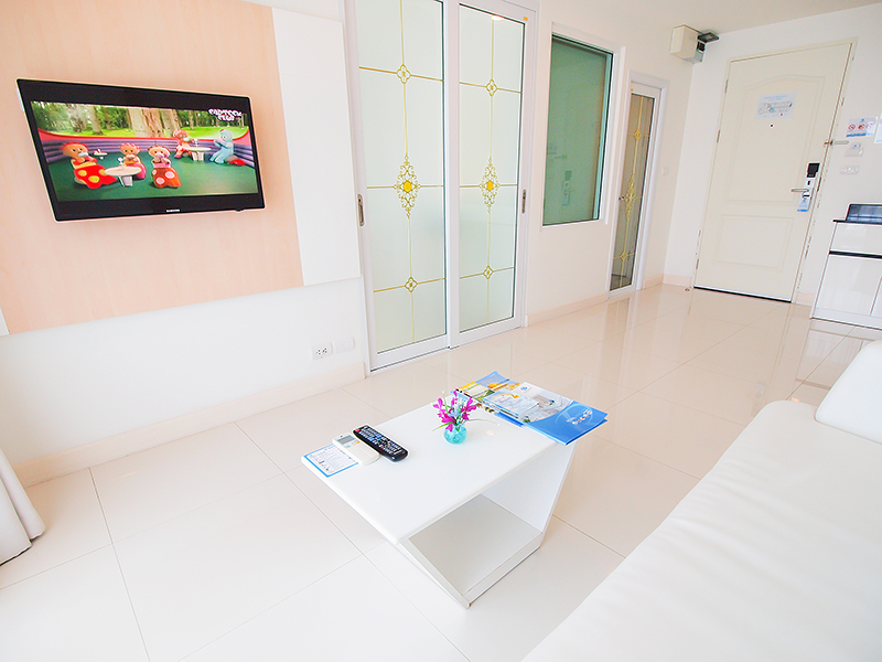 ห้องพักสวยและดูสะอาดมากครับ ใช้สีขาวเป็นหลักตัดกับสีฟ้าซึ่งคงไม่ต้องบอกล่ะนะว่าให้ฟีลท้องทะเล ห้องของเราแบ่งเป็นสองส่วนคือห้องนั่งเล่น มีชุดโซฟา ทีวี มุมมินิบาร์ กว้างขวางสบายใช้ได้เลย