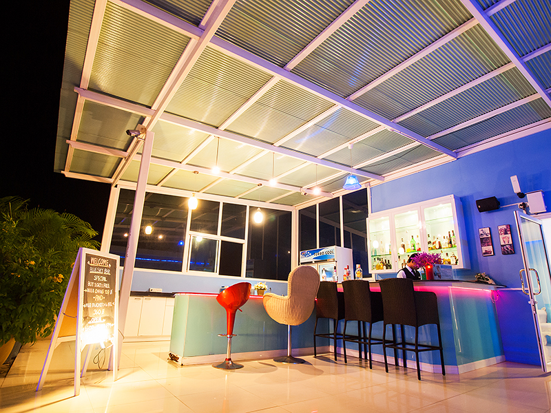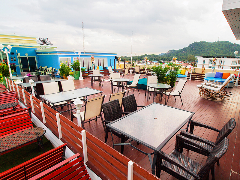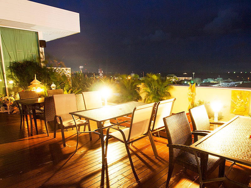 กลับเข้าเรื่องเข้าราวดีกว่าครับ ตอนแรกนึกว่าคงนั่งทานดินเนอร์พูดคุยกันที่ห้องอาหาร The Recipe แต่ปรากฏว่าไม่ใช่ ที่นี่มีห้องอาหารบนดาดฟ้าบรรยากาศดี Blue Sky Bar เปิดตั้งแต่หกโมงครึ่งถึงประมาณห้าทุ่มเที่ยงคืน วันนี้ฟ้าครึ้มแต่ฝนไม่ตก ลมพัดเย็นสบายไปเลย