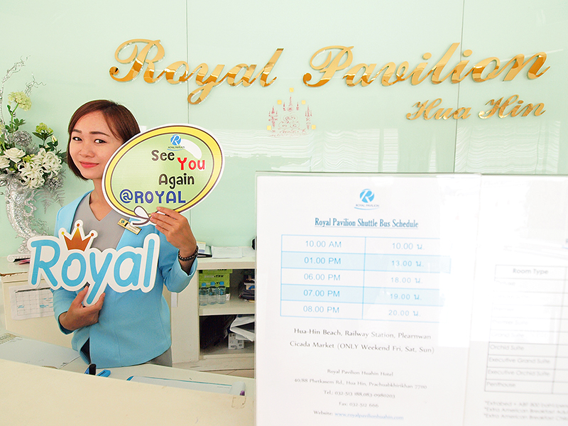 ถึงที่หมายแล้วจึงต้องร้องอ้อ สาเหตุที่ไม่เคยเห็น รอยัล พาวิลเลียน หัวหิน เพราะเป็นโรงแรมสร้างใหม่นี่เอง เปิดมาแค่ประมาณสามปี คราวล่าสุดที่ผมมาขึ้นรถตู้วินตรงนี้กลับกรุงเทพ โรงแรมยังไม่ได้สร้างเลย และวินรถตู้ที่ว่ามาส่งถึงหน้าโรงแรมจริงครับ ลงรถแล้วก้าวอีกยี่สิบสามสิบก้าวก็เข้าโรงแรมแล้วล่ะ