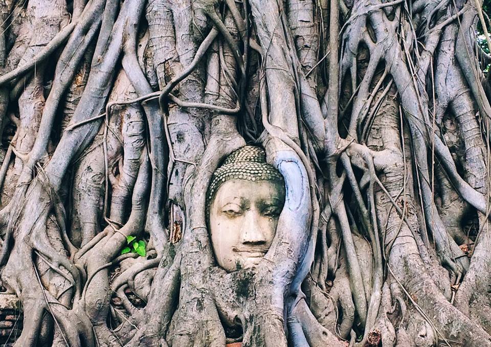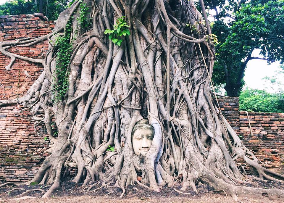 วัดมหาธาตุ : เศียรพระพุทธรูปหินทราย(Unseen Thailand) ซึ่งมีรากไม้ต้นโพธิ์ปกคลุมอยู่ โดยเศียรพระพุทธรูปนี้ เหลือแค่ส่วนเศียร สำหรับองค์พระนั้นหายไป..