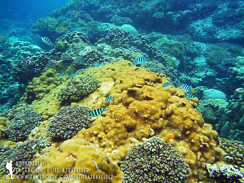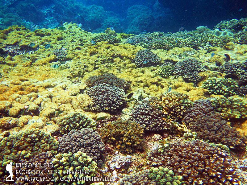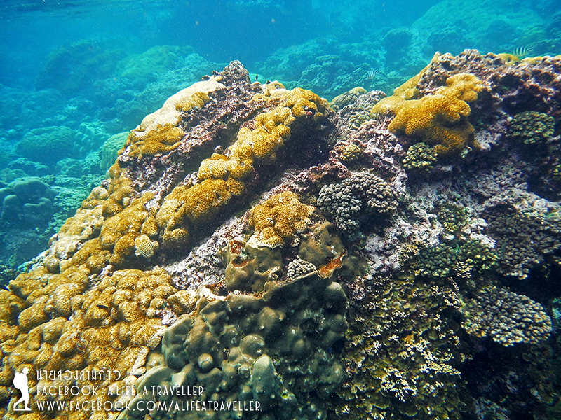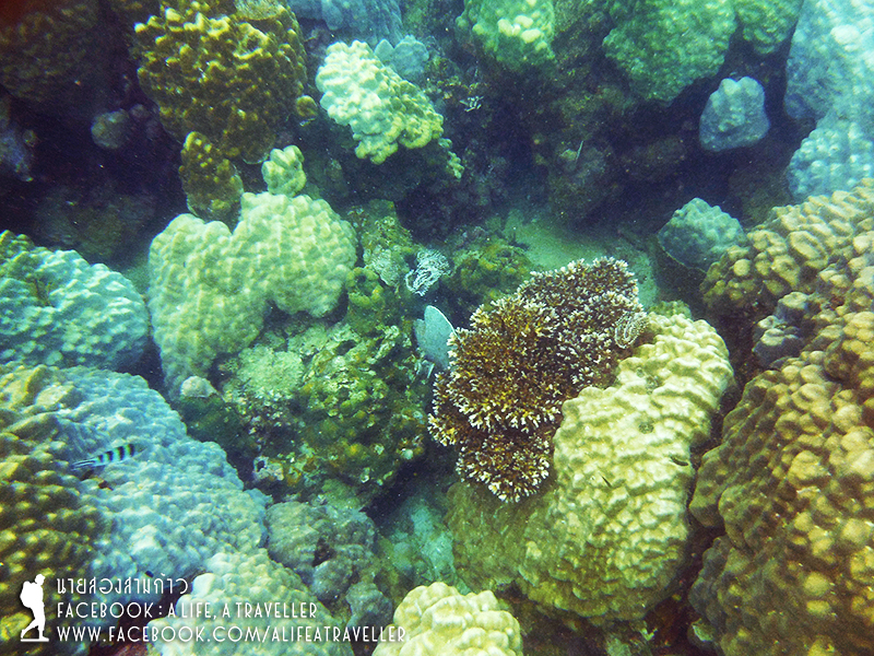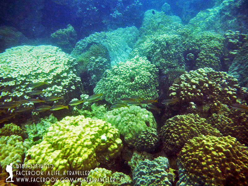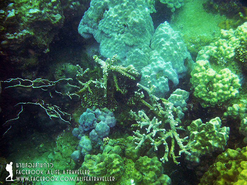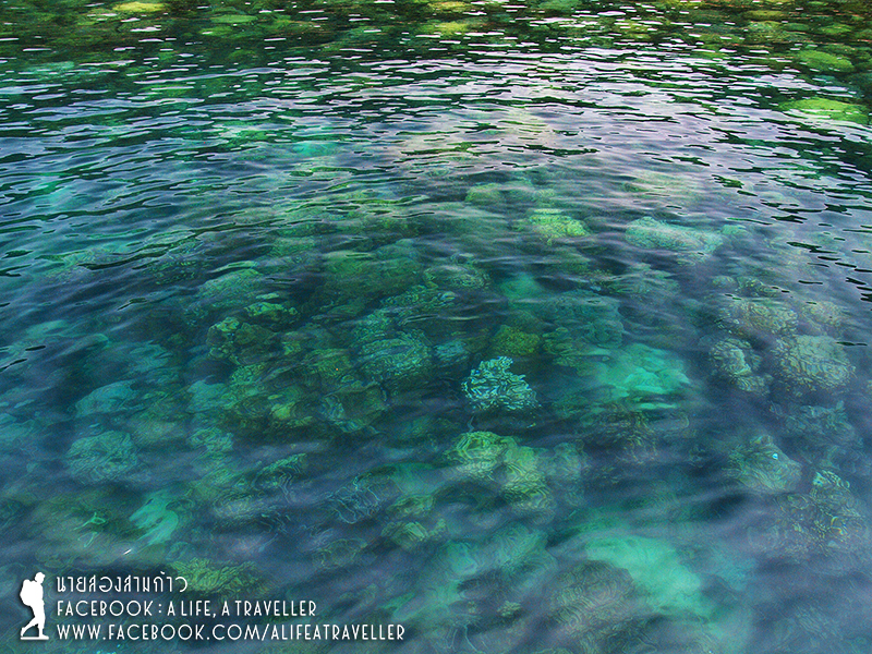 แม้จะไม่มีแดดแต่เห็นอยู่ว่าน้ำใส และปะการังข้างล่างคงอลังการน่าดู