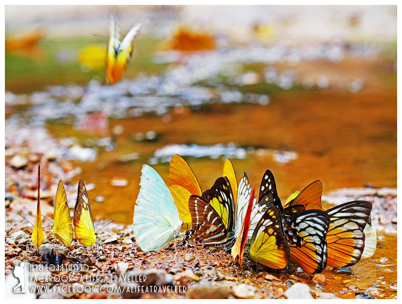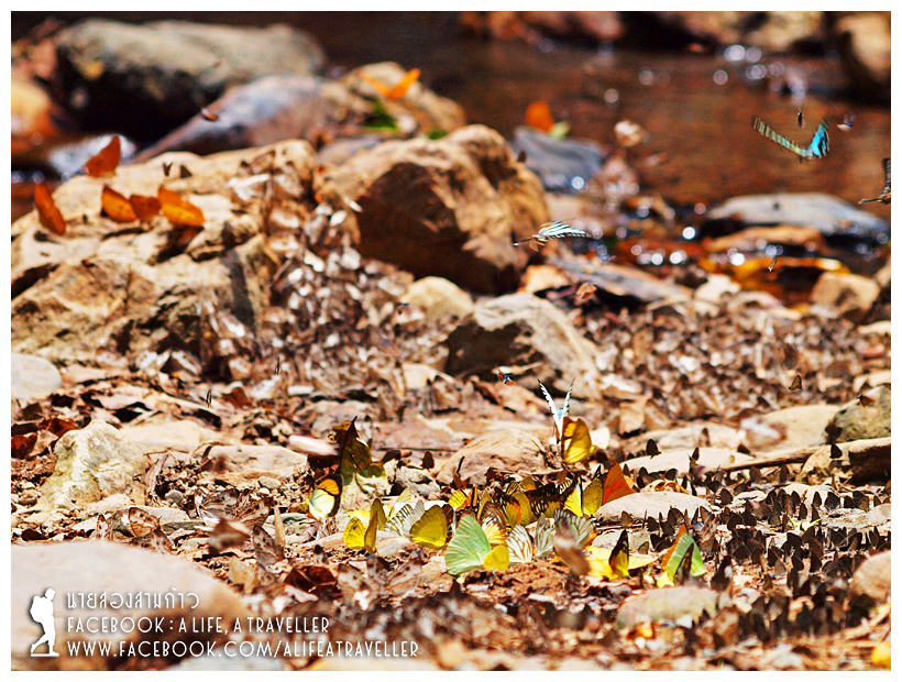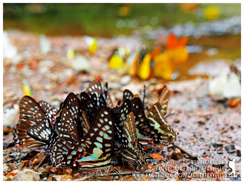 จุดชมผีเสื้ออยู่บริเวณลำธารซึ่งมีสี่จุด คือลำธารตรงที่กางเต็นท์ แล้วก็ลำธาร 1 2 3 ผมเดินตั้งแต่ลานกางเต็นท์ไปถึงลำธาร 3 โน่นเลยระยะทางก็น่าจะสักสองกิโลเมตรเห็นจะได้ เดินสบายๆ ครับ ชมนกชมไม้ไปเรื่อย แต่ใครจะขับรถมาสักลำธาร 1 แล้วจอดทิ้งไว้ก็ได้ รับประกันว่าใครมาเจอฝูงผีเสื้อที่บ้านกร่างต้องตาโตแน่นอน ถ่ายวิดีโอดูอลังการสวยกว่าภาพนิ่งมากครับ ด้วยเวลาเยอะ ผมเลยให้เวลากับผีเสื้อบ้านกร่างแบบเต็มๆ ขับรถขึ้นไปถึงสิบโมงกว่าๆ ลงมาก็สี่โมงเย็นแล้ว