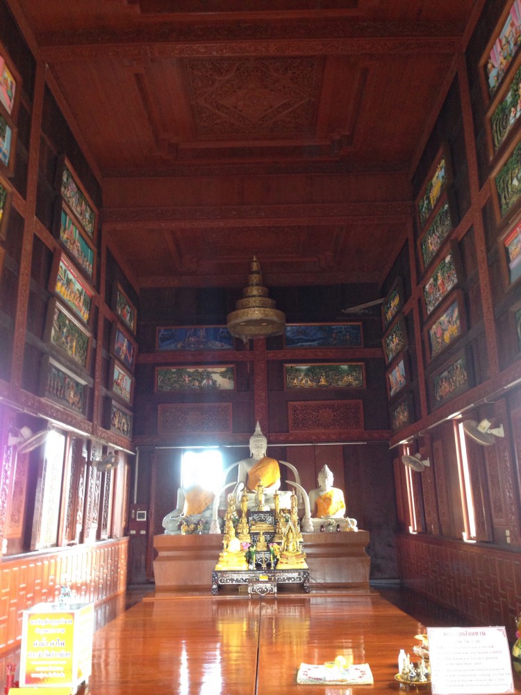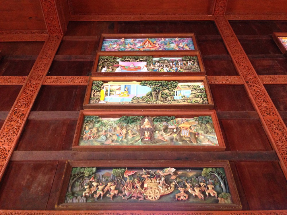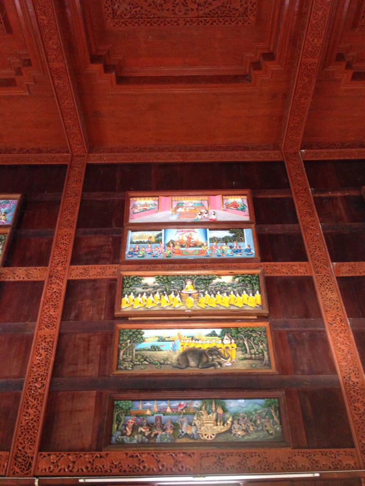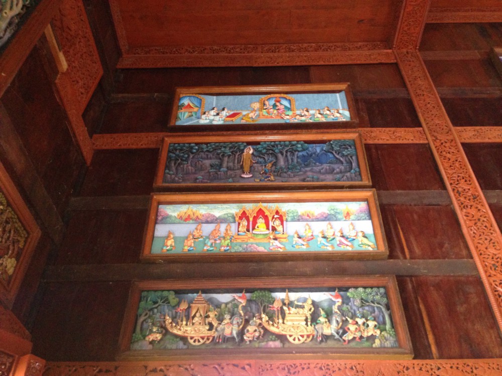 และด้านในจะมีประวัติของพระพุทธเจ้าซึ่งแกะสลักด้วยแผ่นไม้อยู่ด้านบนโดยรอบคับ สวยงามมาก