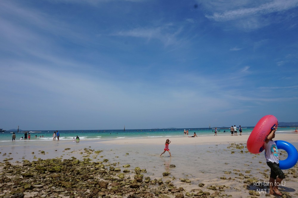 คนไม่เยอะมากเท่าหาดตาแหวน  มีกองหินเหมือนจะเป็นหินปะการัง น้ำขึ้นมาจนถึงบริเวณนั้นในตอนบ่ายๆ