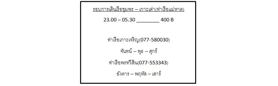 สถานีรถไฟชุมพร – ท่าเรือลมพระยา – เกาะเต่า(อ่าวแม่หาด) ________ 100 + 600 = 700 B