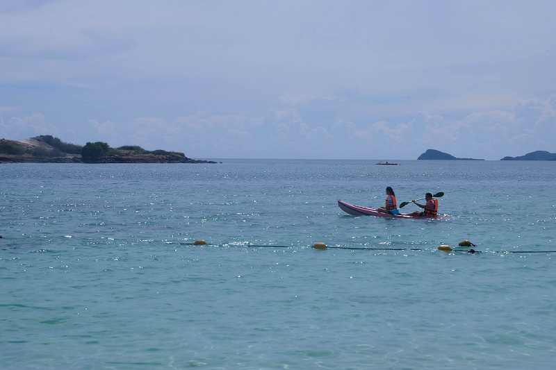 ก็เลยไปจองคิวแล้วรอพี่ทหารเรียก พอเรือว่างพี่ทหารบอกใส่ชูชีพแล้ว เดินไปหยิบเรือ หยิบไม้พายลุยเองได้เลยตอนแรกกะว่าจะไปถ่ายรูปสวยๆบนเรือ เลยเอามือถือ กล้องใส่ถุงพลาสติกไป ปรากฏพอลองจริงเรือยังไม่ทันออกก็คว่ำแล้ว 5555 เลยไปเก็บกล้องก่อน (จะวางกองๆแล้วซ้อนไว้หรือฝากล็อกเกอร์ก็ได้ค่ะ ) แล้วเอาว่ะ !! ไหนๆก็เปียกแล้ว ก็เปียกให้สุด 5555 ล่มแล้วล่มอีก จนในที่สุดก็ออกเรือไปได้ 555 คือมองลำอื่นทำไมเค้าพายได้ ก็เข้าใจ พายไปสักพัก ล่มจ้าคราวนี้ไปล่มกลางทะเล แต่มีชูชีพไม่ต้องห่วงลอยอยู่เหนือน้ำชิวๆ มองไปข้างล่างคือหอยเม่นจำนวนมหาศาล....
