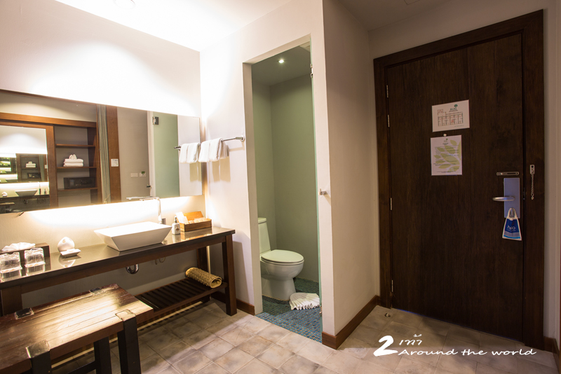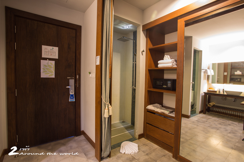 เมื่อเปิดประตูห้องพักเข้าไป ห้องจะแบ่งเป็น 3 ส่วน ในพื้นที่ส่วนแรกจะเป็นห้องน้ำ ฝั่งซ้ายจะเป็นห้องอาบน้ำ ซึ่งตู้เสื้อผ้าจะอยู่ในพื้นที่ของห้องอาบน้ำครับ เวลาอาบน้ำคงต้องรูดม่านเพื่อปิดให้มิดชิดสักหน่อย ส่วนด้านขวามือจะเป็นในส่วนของอ่างล้างหน้าและห้องส้วมครับ