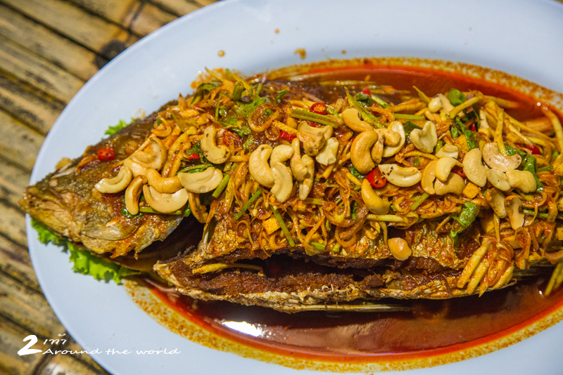 ปิดท้ายด้วยปลาลุยสวน เป็นปลาพื้นบ้าน ผมจำชื่อปลาไม่ได้แล้ว น้ำหนักประมาณ 1 กก. ปลาทอดออกมาได้กรอบกำลังดี ราดด้วยน้ำยำที่ทำด้วยน้ำพริกเผา โรยหน้าด้วยเม็ดมะม่วงหิมพานต์ รสชาติออกหวานนำจากน้ำพริกเผา อร่อยดีครับ เมนูนี้เกลี้ยงจานเลย เมนูนี้ 400 บาทครับ