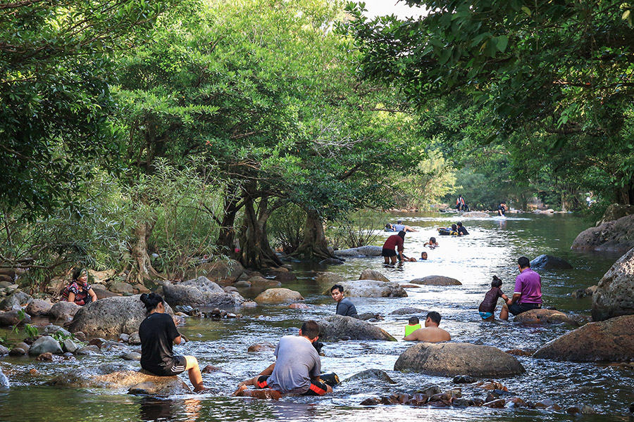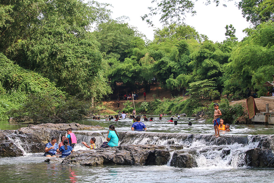 ตามแม่น้ำนครนายกมีแห่งเล็กแก่งน้อยมากมาย ห่างกันกิโลสองกิโลก็มีชื่อเรียกให้ต่างกันแล้วล่ะ แต่คงเป็นแก่งสามชั้นนี่แหละที่ยอดฮิตที่สุด เดินทางสะดวก สายน้ำไหลเย็นทั้งปี มีการจัดทำซุ้มเพิงสำหรับนั่งรับประทานอาหารพักผ่อน มีของกินของขาย มีแนวตลิ่งริมน้ำ มีห่วงยางให้เช่า เรียกว่าครบสูตรสำเร็จแห่งศิลปะการเล่นน้ำเลยล่ะ (ฮา...)