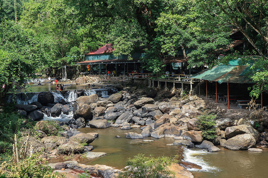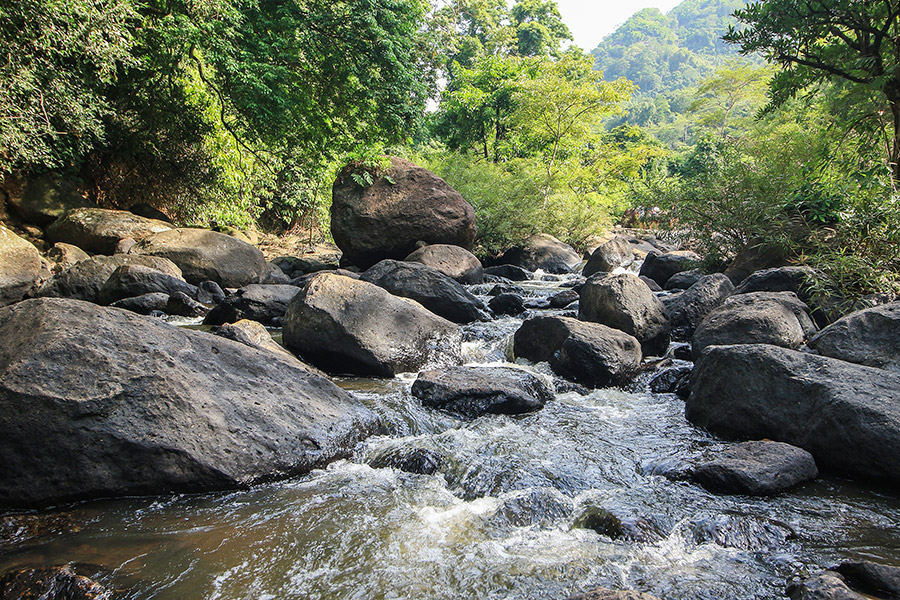 ทางเดินศึกษาธรรมชาติท่ามกลางร่มไม้ใหญ่พาเราเดินขึ้นไปตามชั้นน้ำตก บางช่วงเป็นลำธารไหลผ่านซอกหิน น้ำสวยใสน่าเล่น บรรยากาศสดชื่นมาก ถ้าอยากเล่นแบบแอ่งใหญ่ๆ ไม่ไกลจากทางเข้ามีฝายน้ำล้นให้แช่สบายใจ