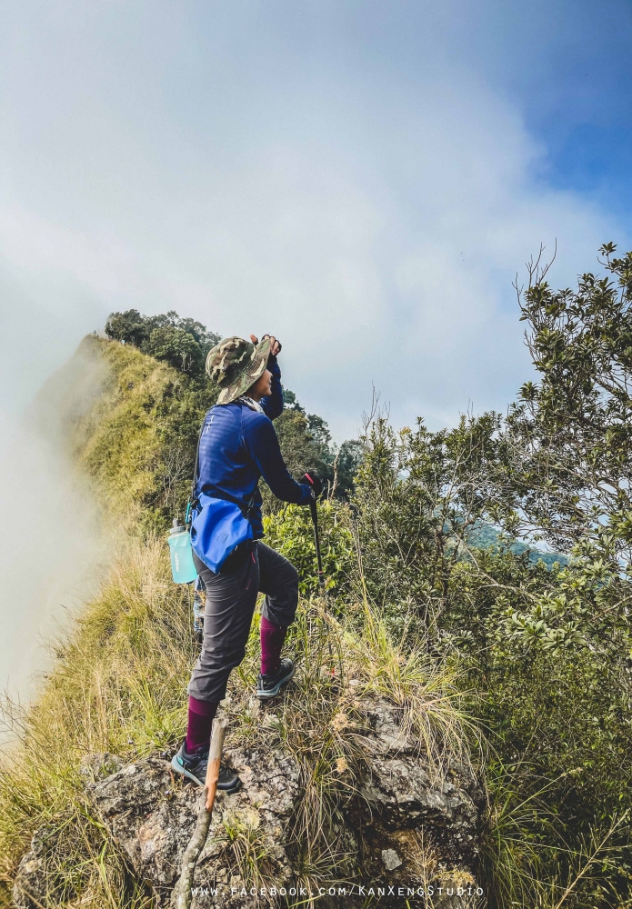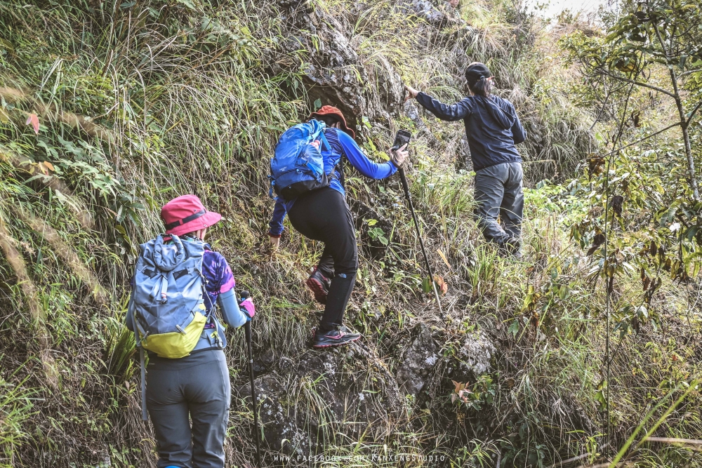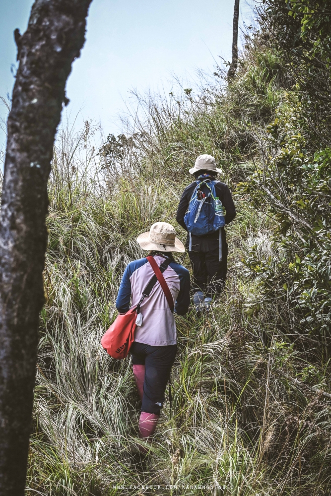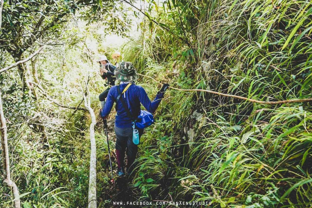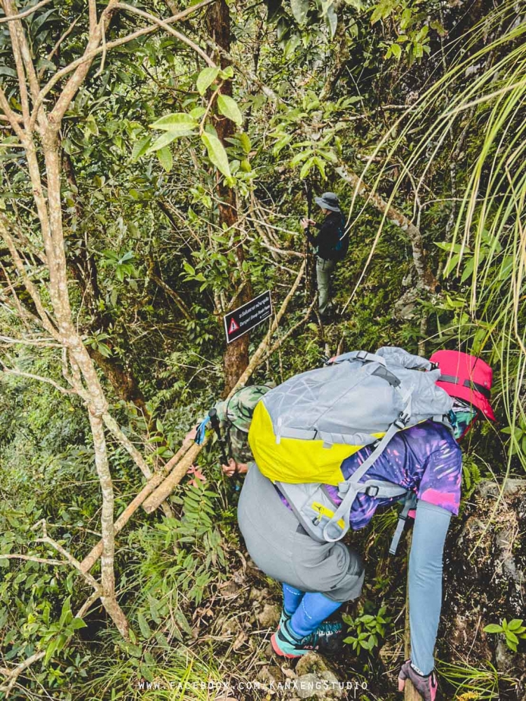 5. ลักษณะเส้นทางการเดิน >> เส้นทางเดินเท้าทางราบมีน้อย ส่วนใหญ่เป็นทางชันมากถึงมากที่สุดเดินขึ้นไต่ยอดเขาไปประมาณ 3 ถึง 4 ยอด ยอดสุดท้ายระยะทางแค่ 500 เมตร ดูเหมือนจะเดินใกล้ถึงแต่ก็ไม่ถึงสักที